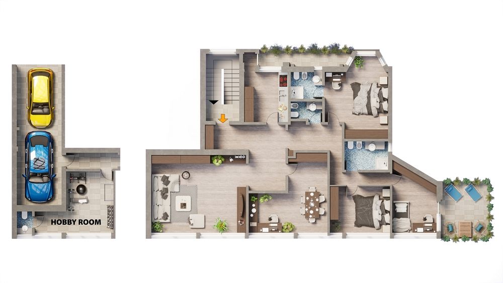 220 m² Verkaufsfläche, eine doppelte Ausrichtung Süd/Ost-West, einen großzügigen Hobbyraum mit WC und eine Doppelgarage.