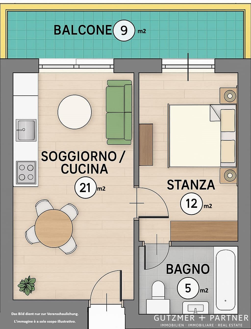 Elegante Zweizimmerwohnung in Sonnen-Südlage, absolut ruhig intern gelegen, 66 m² Handelsfläche, mit großem Balkon, Keller und Garage, vollständig möbliert, und mit allen Bequemlichkeiten in nächster Nähe.